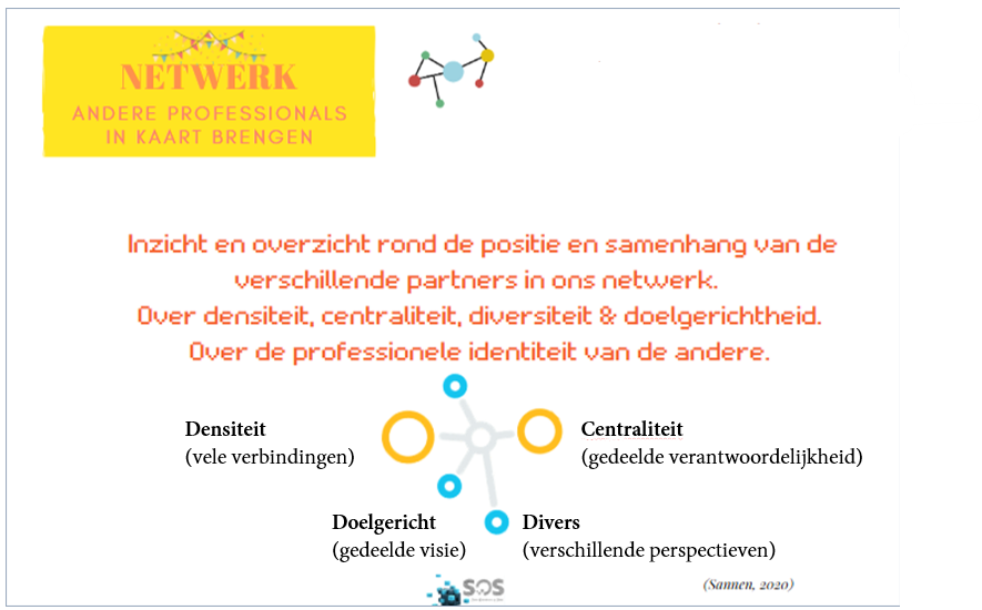 Een waardevolle insteek om werk te maken van een duidelijk in- en overzicht van het interprofessionele netwerk halen we uit onderzoek van Sannen (2020[1]). In dit onderzoek wordt gesteld dat er voor het uitbouwen van een krachtige professionele samenwerking een aantal belangrijke parameters te verkennen zijn om het netwerk bloot te leggen. Deze parameters zijn zeker van belang wanneer we inzicht en overzicht willen over de interprofessionele samenwerking tussen de verschillende partners. Sannen (2020) spreekt over vier parameters: densiteit, centraliteit, diversiteit wat betreft kennis & ervaring, en doelgerichtheid.