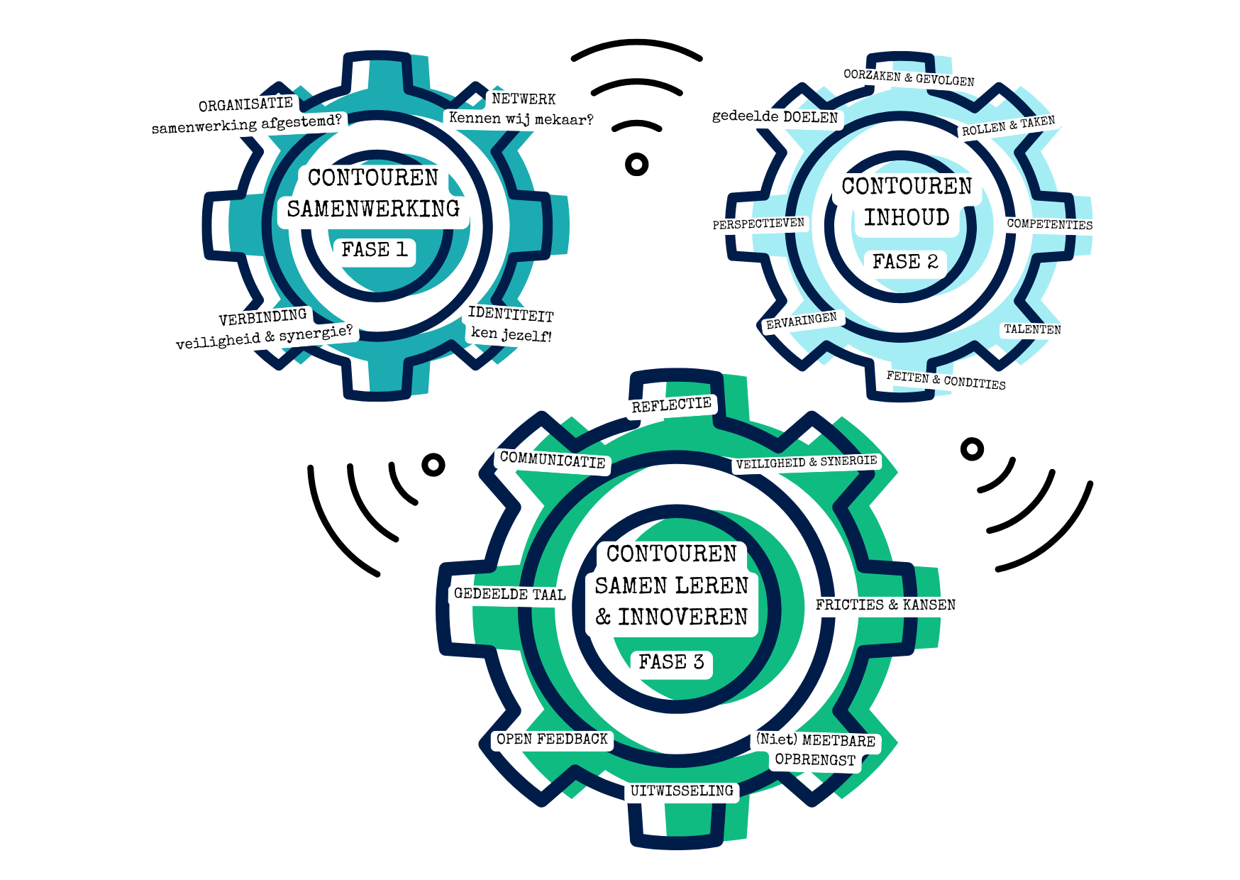 We belichten, in wat volgt, beknopt per bouwsteen enkele elementen van belang om bewust bij stil te staan. Elke kaart maakt deel uit van een reflectiewaaier. Op de kaart drukken, brengt je naar de gehele waaier.