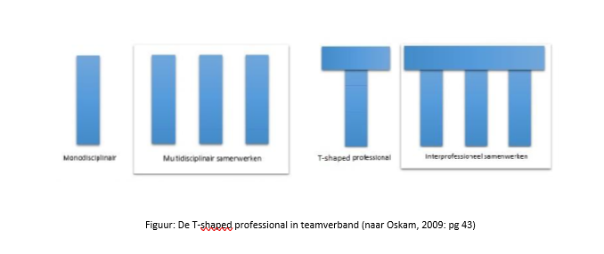 Interprofessioneel samenwerken vraagt om professionals die niet alleen goed zijn in hun eigen vak, maar ook in staat zijn om verbindingen te leggen met andere disciplines. Dit type professional wordt vaak omschreven als een T-shaped professional (Oskam, 2009[1], Van Zaalen,Y., Mulderij, M., Deckers,S. (2020)[2]).